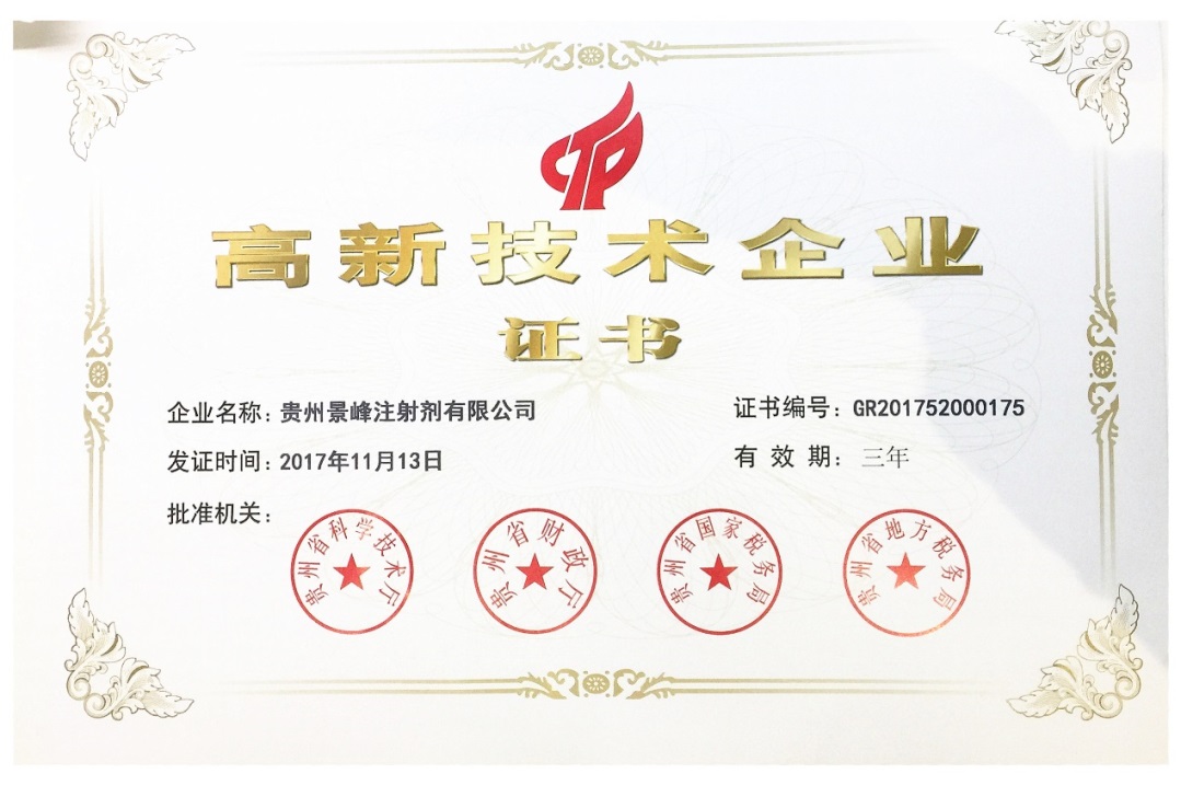2017年12月13日,贵州AG尊龙凯时注射剂有限公司再一次被授予了“高新技术企业”荣誉称号,实至名归、可喜可贺!