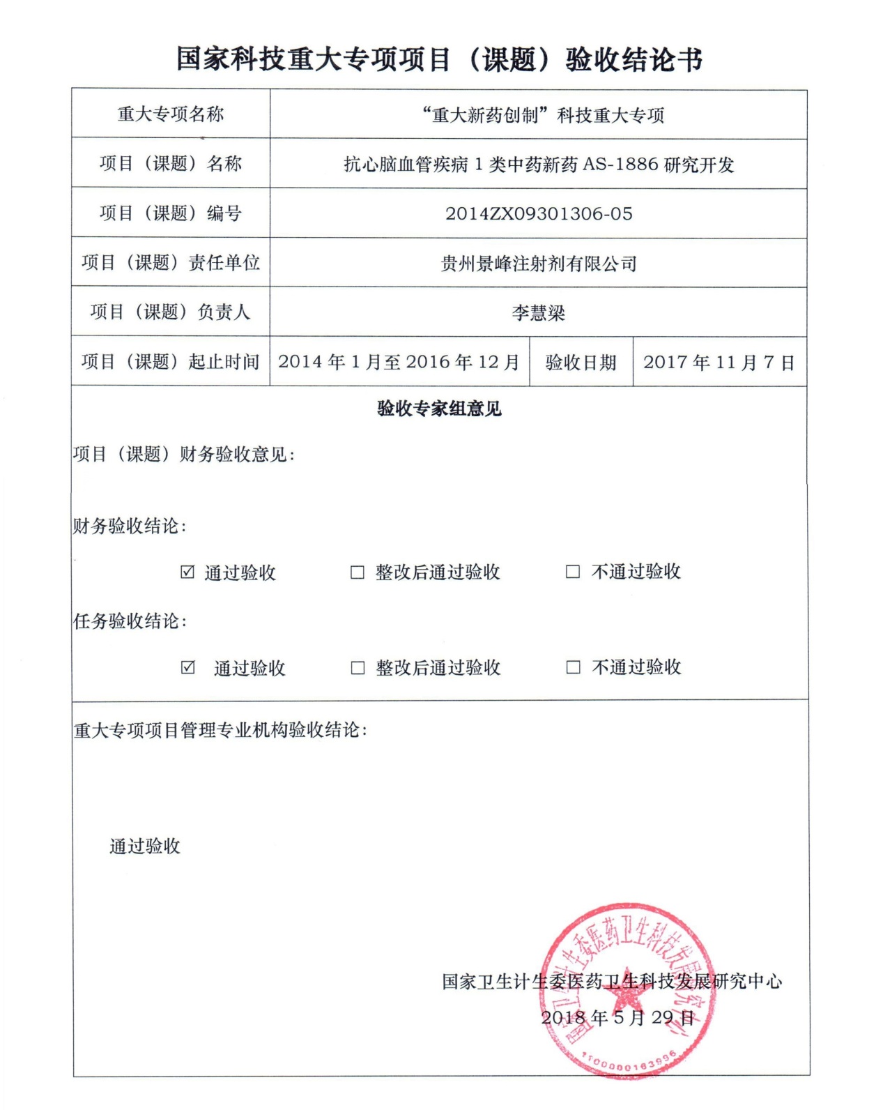 2018年7月5日,贵州AG尊龙凯时获得国家卫生计生委医药卫生科技发展研究中心下发的重大专项验收结论书,标志着公司承担的“抗心脑血管疾病1类中药新药AS-1886研究开发”顺利通过考评验收。该项目于2014年批准立项,属国家科技重大专新药创制专项《源于中药的1类新药研发与释药系统研究》项目的子课题,课题获得中央财政补助资金482.47万元,建设期为2014年1月-2016年12月。